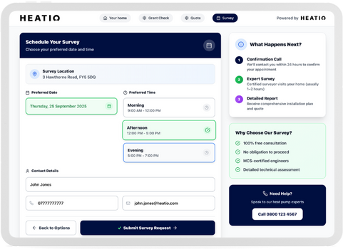 Heatio fixes this. Our digital customer journeys capture the right property data up-front, check funding eligibility, and personalise advice — so you spend time only on enquiries that convert into installations.